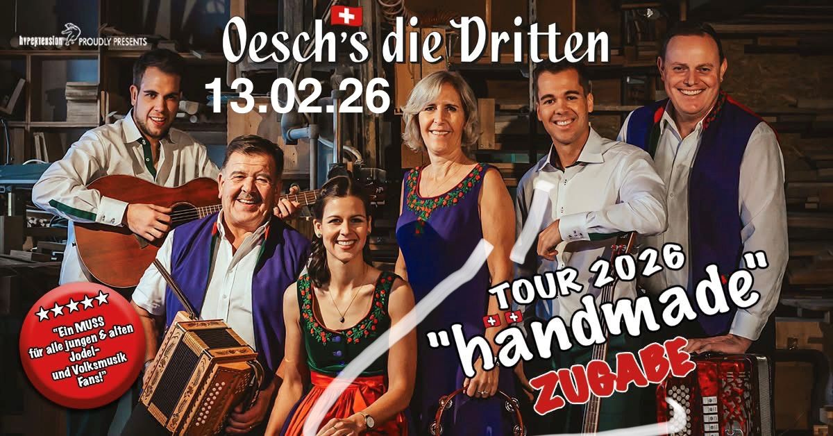 Es ist wieder soweit! Nach dem überaus erfolgreichen Tourauftakt im letzten Jahr kommen Oesch´s die Dritten, die in der Schweiz längst Superstars der Volkmusik sind, wieder nach Deutschland. Sie präsentieren ihre bekanntesten Songs und natürlich Songs aus dem aktuellen Album „Händmade“. Oesch’s die Dritten stehen vor allem für eines: Volksmusik ist Herzmusik! Oesch’s die Dritten stehen für Lebensfreude, Familienzusammenhalt und Respekt. Ihre Musik verbindet Tradition mit Moderne, und sie scheuen sich nicht, Elemente aus Country, Blues und Schlager einzuflechten. Ob Mundart, Deutsch, Französisch, Englisch oder Spanisch, Oesch´s die Dritten lieben es vielseitig und kontrastreich. Mit ihrem Motto „Oeschmusik ist Herzmusik und Herzmusik kennt keine Grenzen“ bringen sie Emotionen und Begeisterung auf die Bühne, ein Erlebnis, dem sich kein Publikum entziehen kann. Veranstalter: Hypertension-Music-Entertainment GmbH